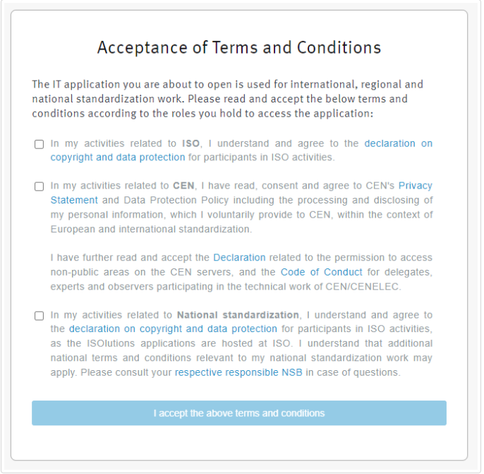 - If the user is granted a role in a new working area, he/she will be requested to accept T&Cs related to this new working area (ISO, CEN or national) upon next login.