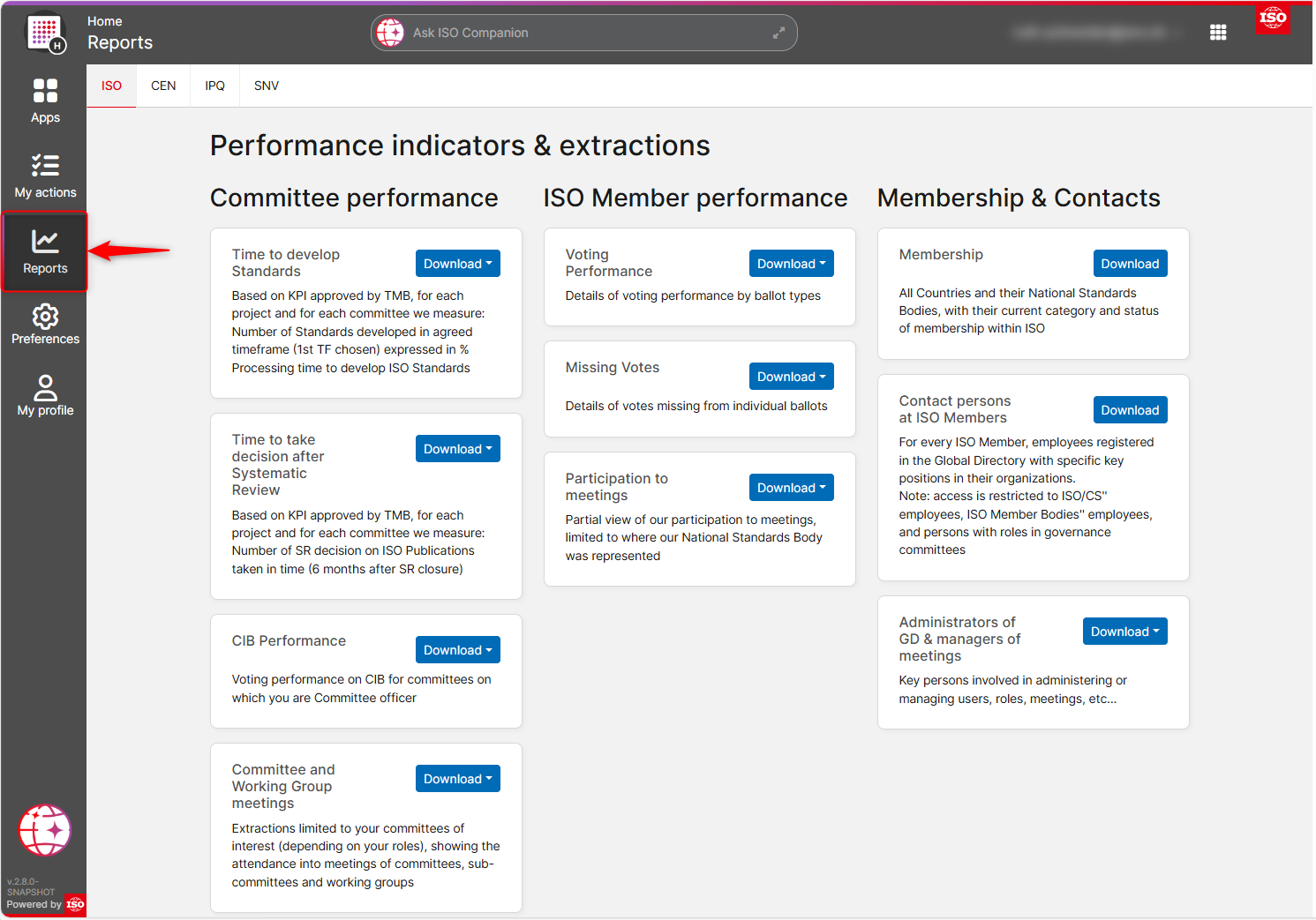 Once you have logged in to the ISO Home portal, you can access the Reports/Performance indicators & Extractions section by clicking on Reports in the left navigation tool bar.