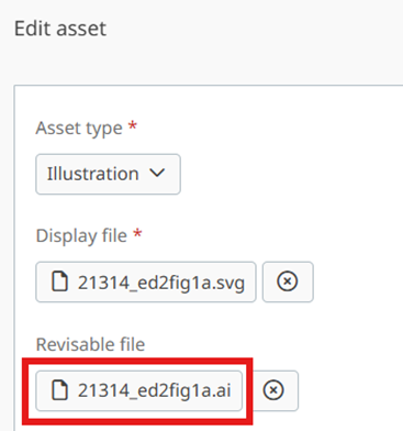 - Display file (PNG, JPG, SVG) - the file that will be seen in the document until it is processed by ISO/CS. If a display file is not available from a previous edition or from the creator of the graphic, this can be a screenshot.