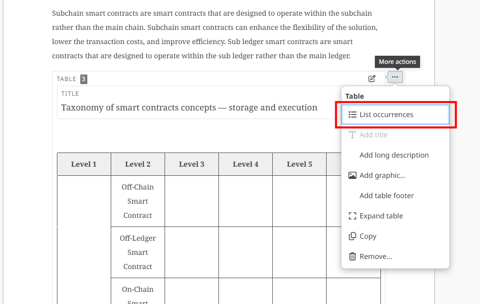 To identify all cross-references made in the document to a specific element, click on the three dots menu for the relevant element and select List occurrences
