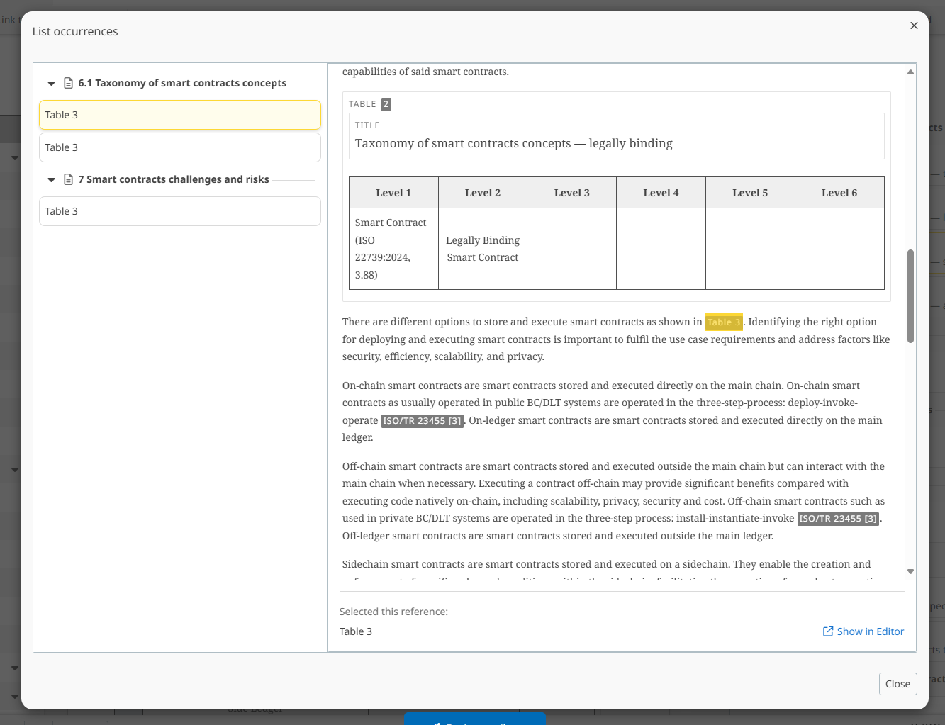 The following window will show you where in the document the element has been referred to and how many time. In this example, Table 3 has been referred 3 times, twice in clause 6.1 and once in clause 7.