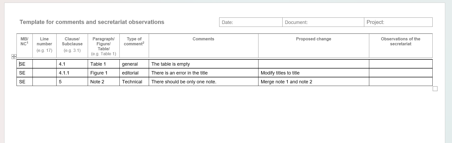 Refer below to a screenshot of a sample ISO/IEC commenting template used to upload comments in context of specific elements in an online document.