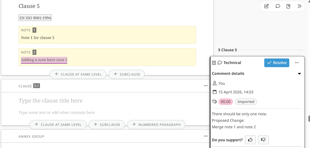 If the clause number does not match the clause or subclause number in the online document, the system returns an error as it doesn't know where the comment(s) belong in the document.