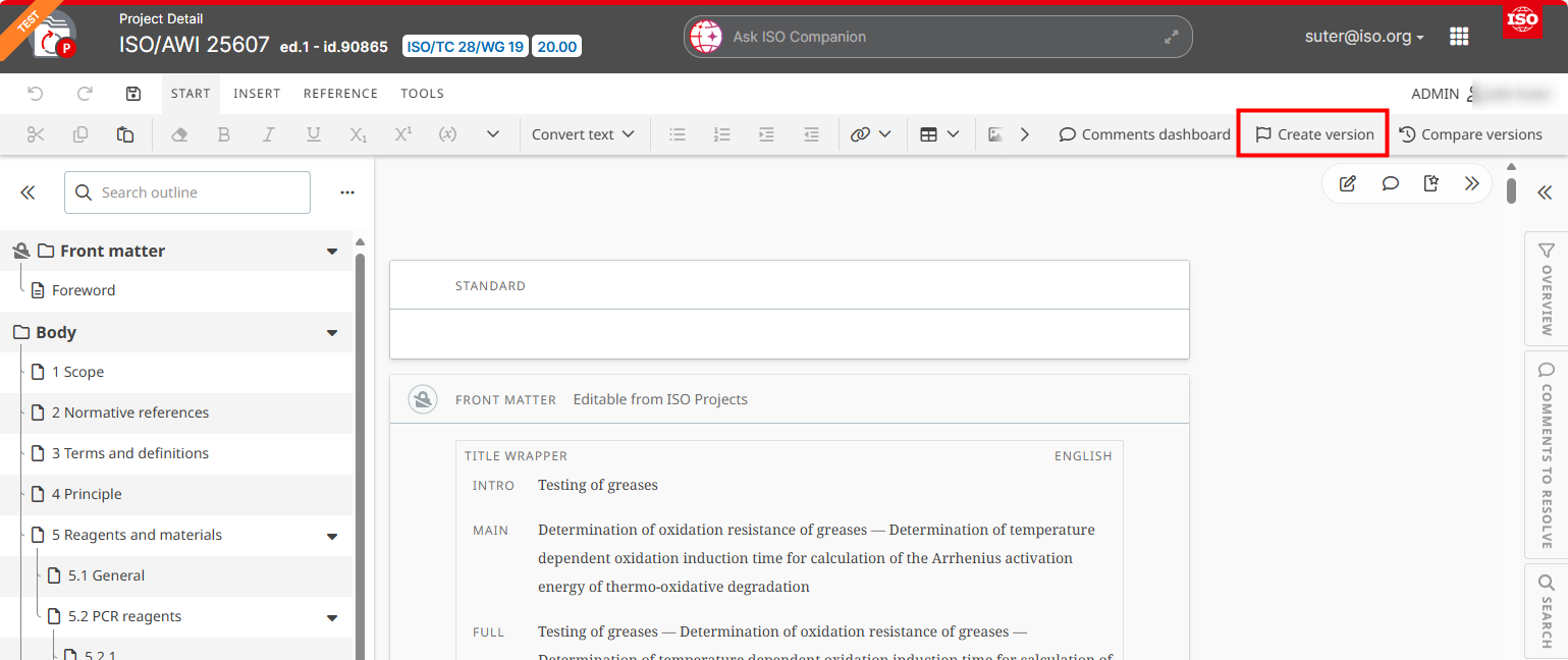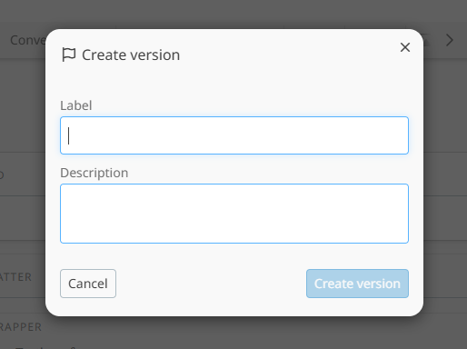 To save a version of the document at a specific date and time, click on Create version. You can add a label and description to the version so it can be easily identified. The date and time is automatically added to the version
