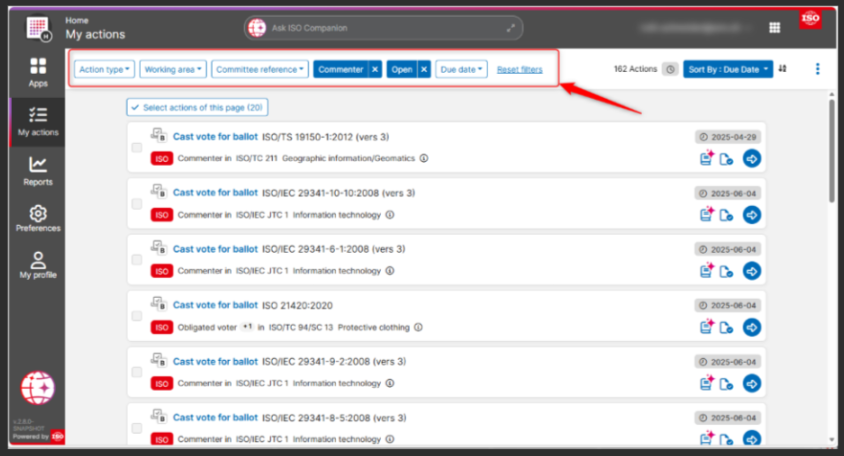 - Working area - allows you to search an action by ISO, CEN, and your National working area.