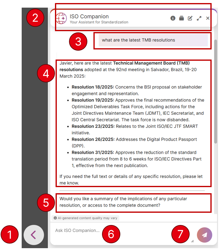 The companion is proficient in ISO's authoritative sources and provides its sources for more transparency and to allow users to read further on a specific subject. By default, it engages with users in English but is also capable of translating previous conversations or engage directly in another language if it detects that the user is asking questions in another language.