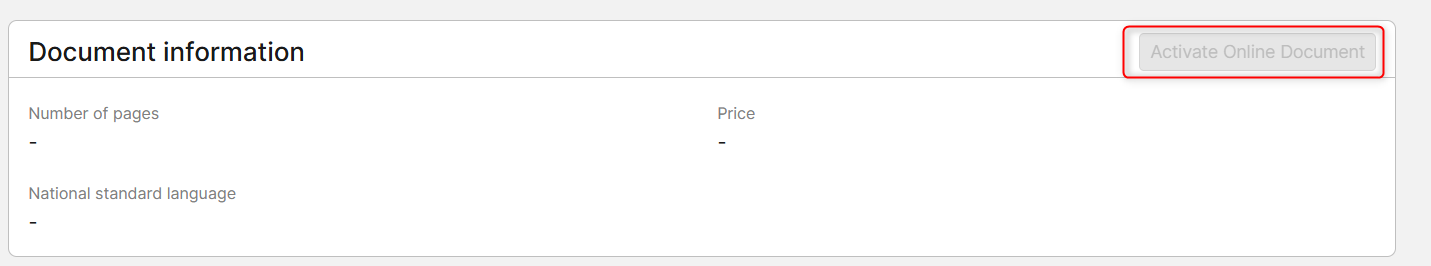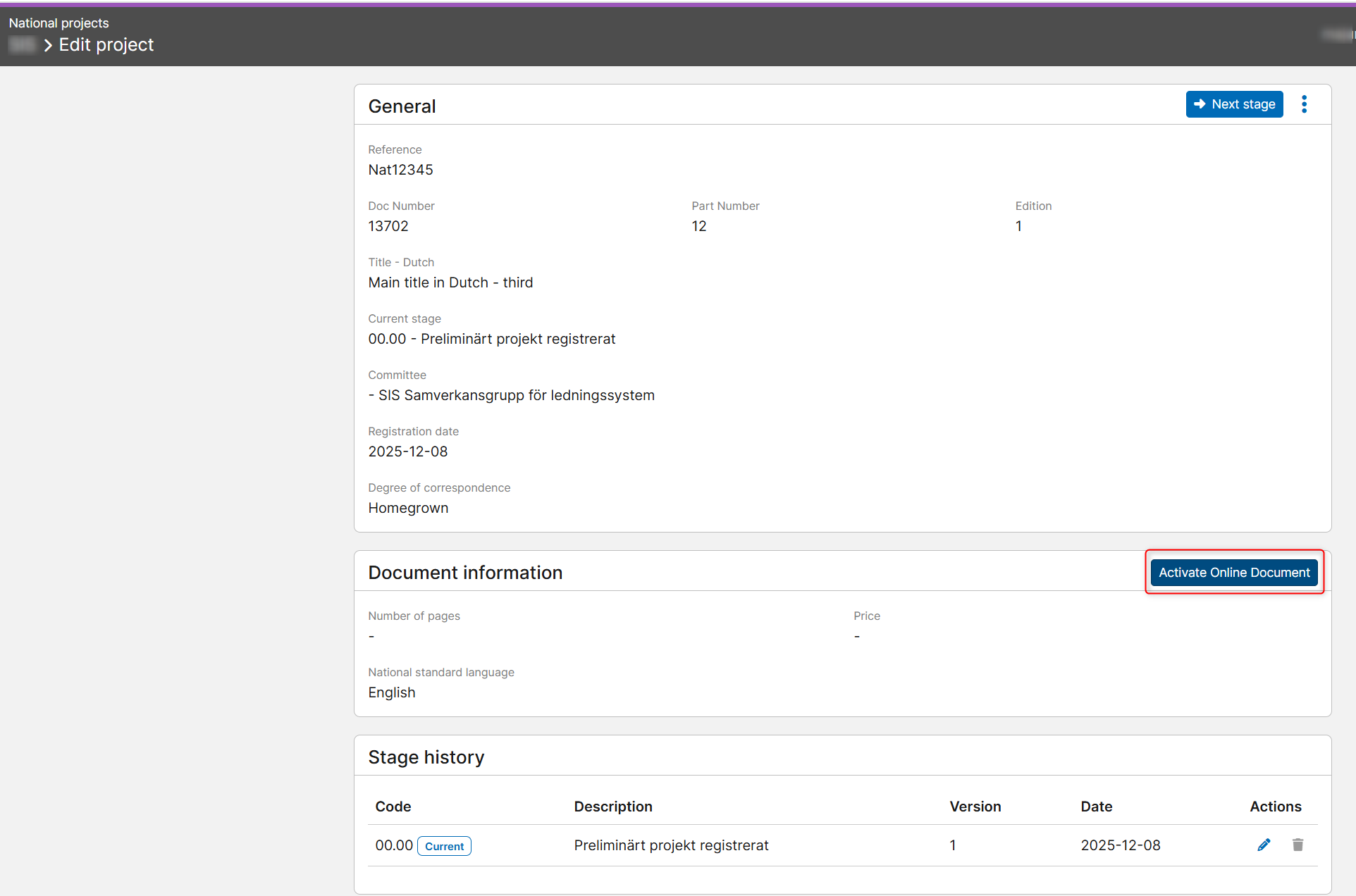 If the Activate Online Document button is disabled, it means the the mandatory fields: Degree of correspondence and National standard language have not been maintained for the national project
