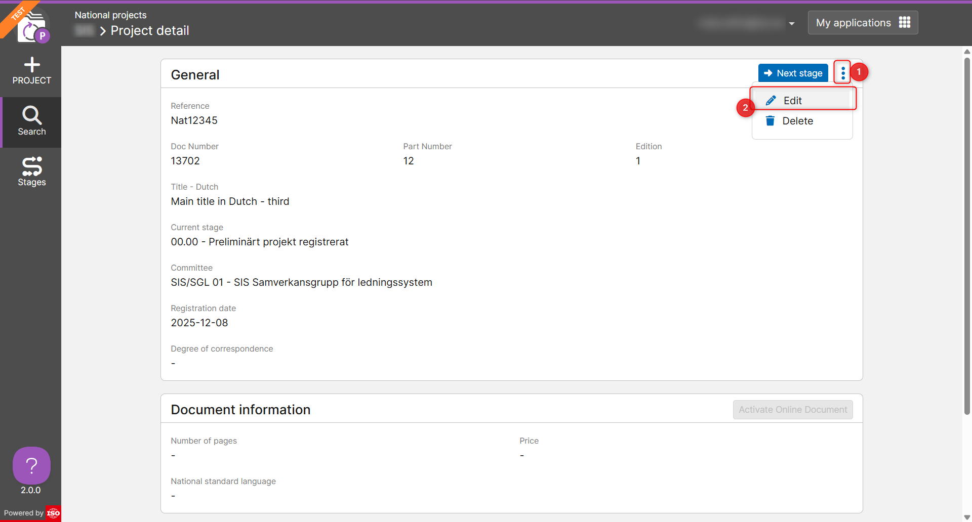 To Edit a national project, click on the three dots action menu in the General section, and select Edit