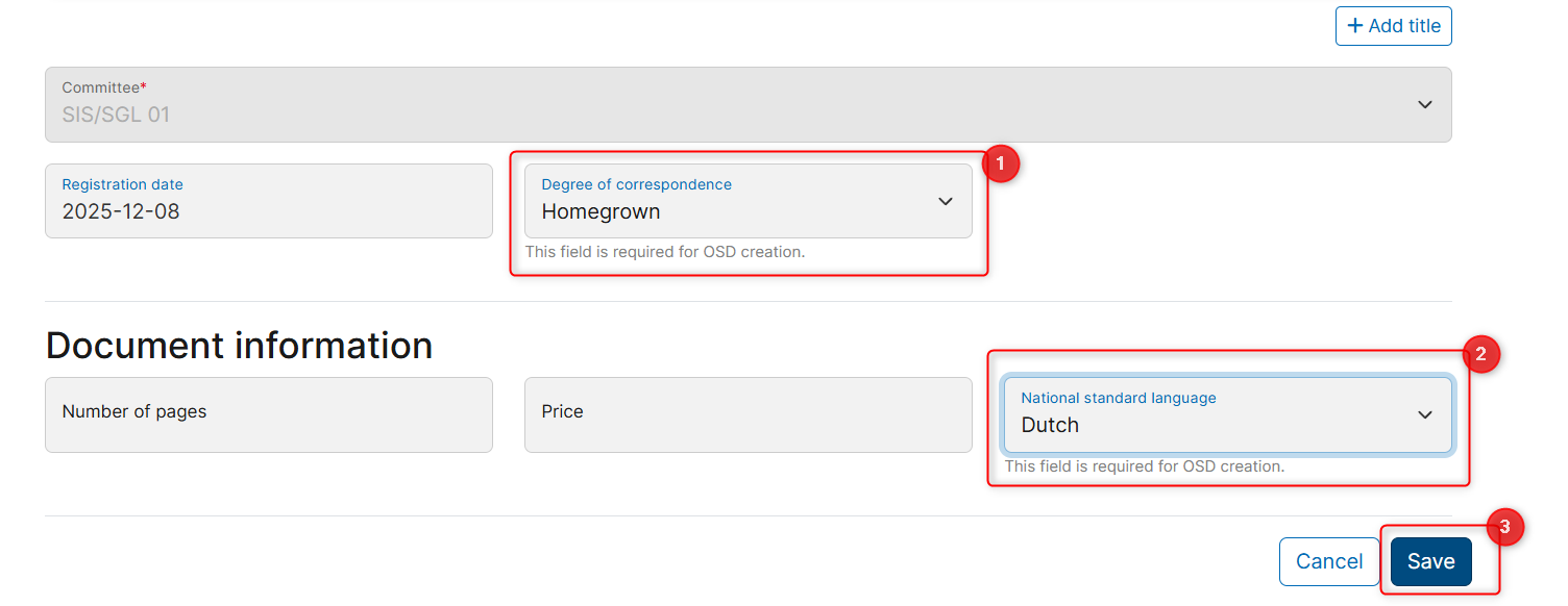 | Title # | Use the fields below to maintain the title of the national standard. At least one title must be specified. Optionally, multiple titles can be added by clicking on the + Add title button. | |